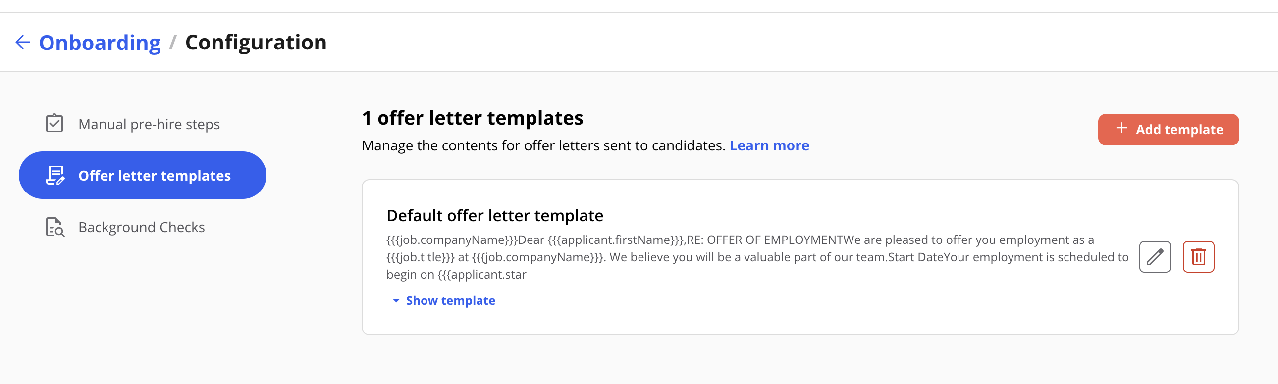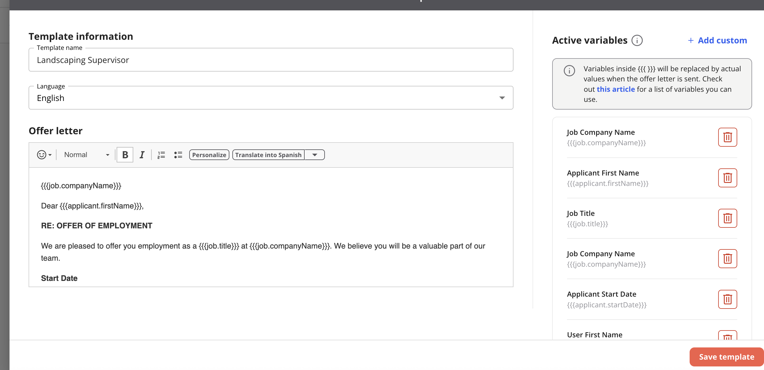From here you can add in the template you'd like to use as well as any variables you want us to pre-populate from the applicants information at the time of offer letter creation.