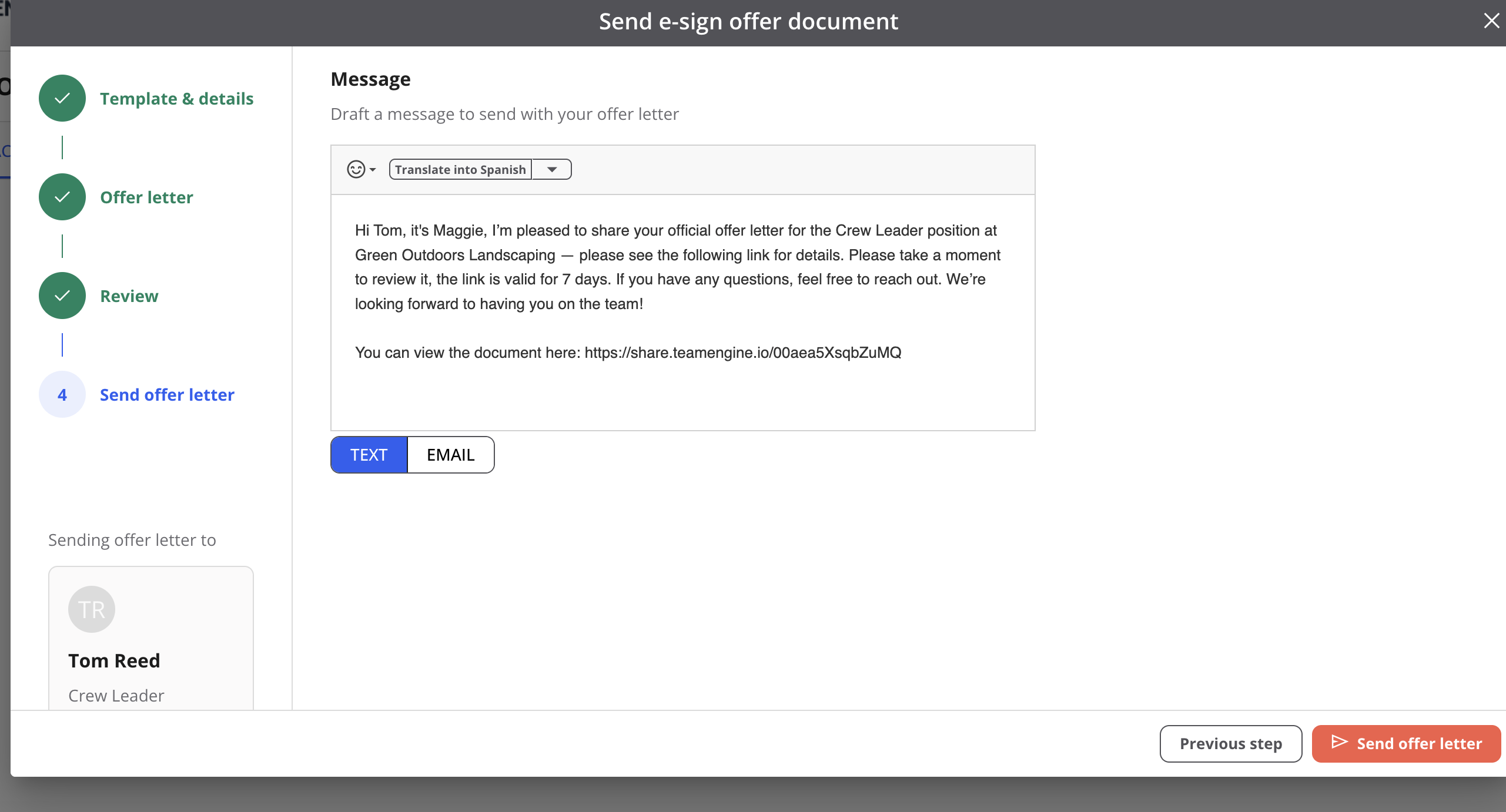 At the end of the flow, you will be prompted to message the new hire the offer letter via text.