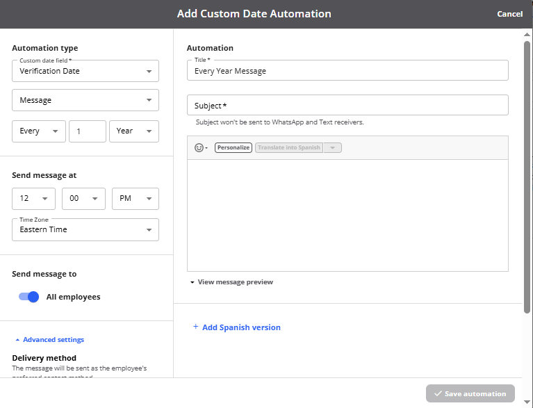 Custom Date Automations allow you to automatically send messages based on a specific date stored on an employee or applicant profile. These automations help you stay proactive, improve engagement, and eliminate manual tracking for important milestones.