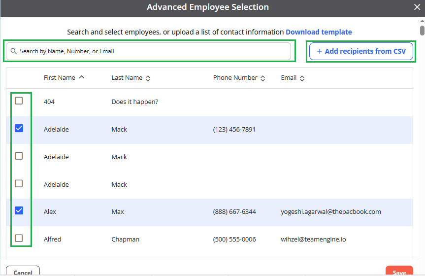 - Upload a CSV/Excel sheet of contact information for bulk messaging.