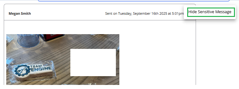 By clicking on the three dots menu on a message item and selecting "Hide Sensitive Message," users can obscure the message. It will be replaced with:
