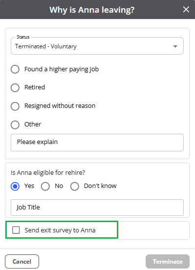 When marking an employee as Quit or Fired, you’ll have the option to send them an Exit Survey by selecting the corresponding checkbox.