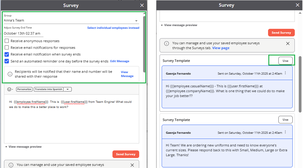 Once a survey message is saved as a Saved Survey, simply click "Use" to auto-paste it into your message field, saving you time and effort.