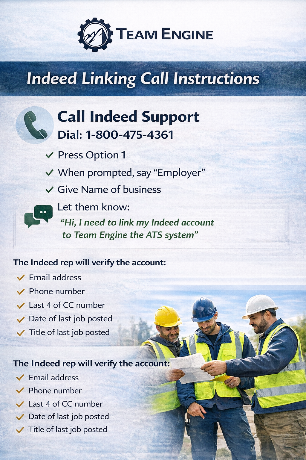 - You'll want to ask the following: "I would like to connect my account to our ATS system, the feed name is Team Engine (it is important that you say Team Engine or previously known as Hiring Engine, it needs to match the feed name exactly and they still have a previous name of ours on file).