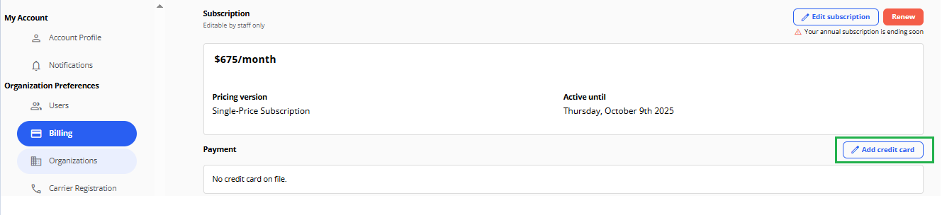 If you haven’t added a credit card yet, you’ll see an orange Add Credit Card button. Click it and enter your card information.