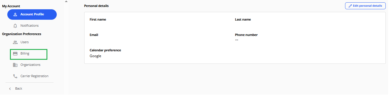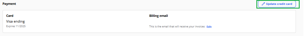 If you already have a card on file, you’ll see your current card details and the email address used for invoices and receipts. To make changes, click the ✏️ pencil icon next to the information you’d like to update.