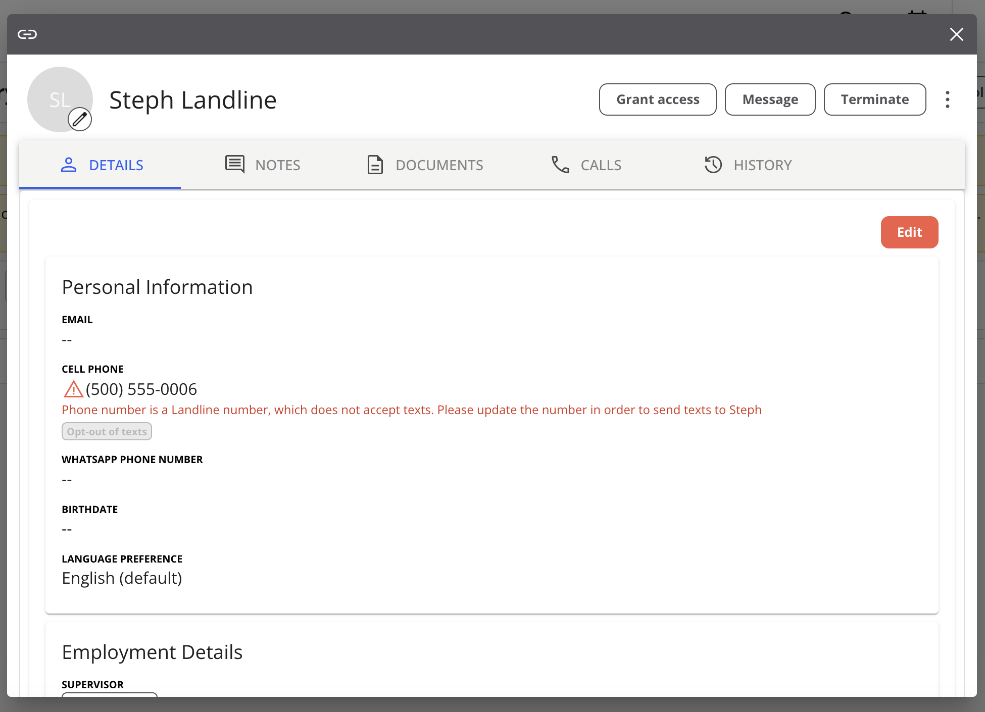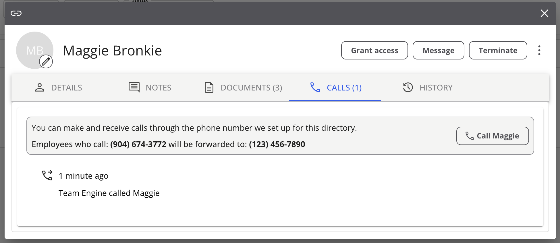 The Calls tab allows you to make outbound phone calls to employees while keeping your personal number private. While calls are not recorded, they are timestamped, so you can easily track when past calls took place.