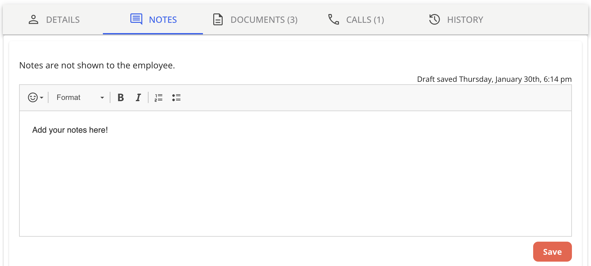 The Notes section in an employee profile is a convenient place to document important information, whether you're preparing for a performance review, sharing insights with other supervisors, or saving key details for future reference.